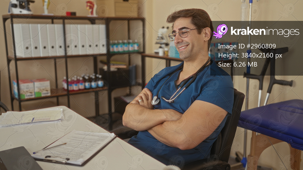 Male doctor in blue scrubs with stethoscope seated at desk with paperwork arms crossed smiling in clinic; confidence approachable care.