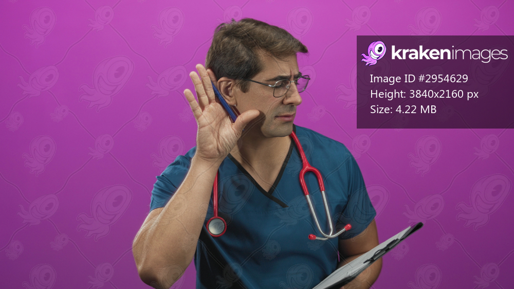 Male doctor in blue scrubs wearing red stethoscope and glasses holds clipboard and raises hand cupped to ear in studio; concerned focus.