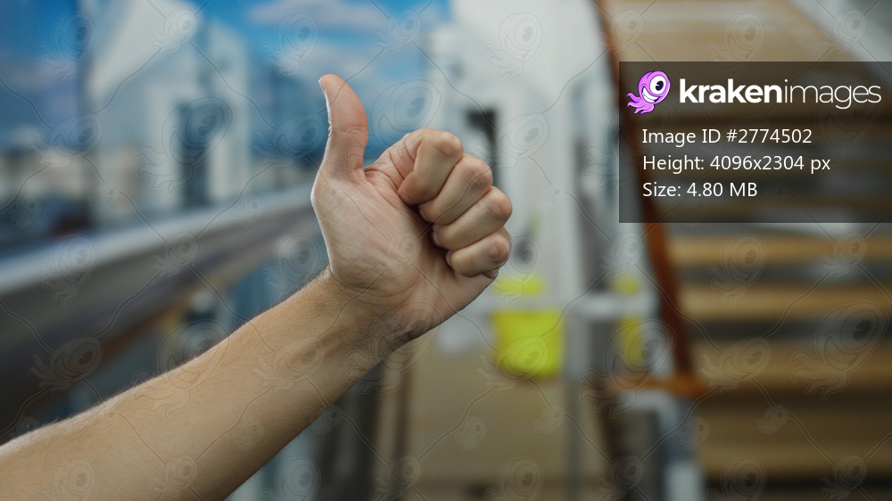 Male hand giving thumbs-up on cruise ship outdoors with blurred seaside background showcasing positivity and approval during travel journey.