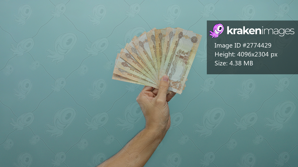 Male hand holding a fanned-out stack of united arab emirates dirham banknotes against a blue background.