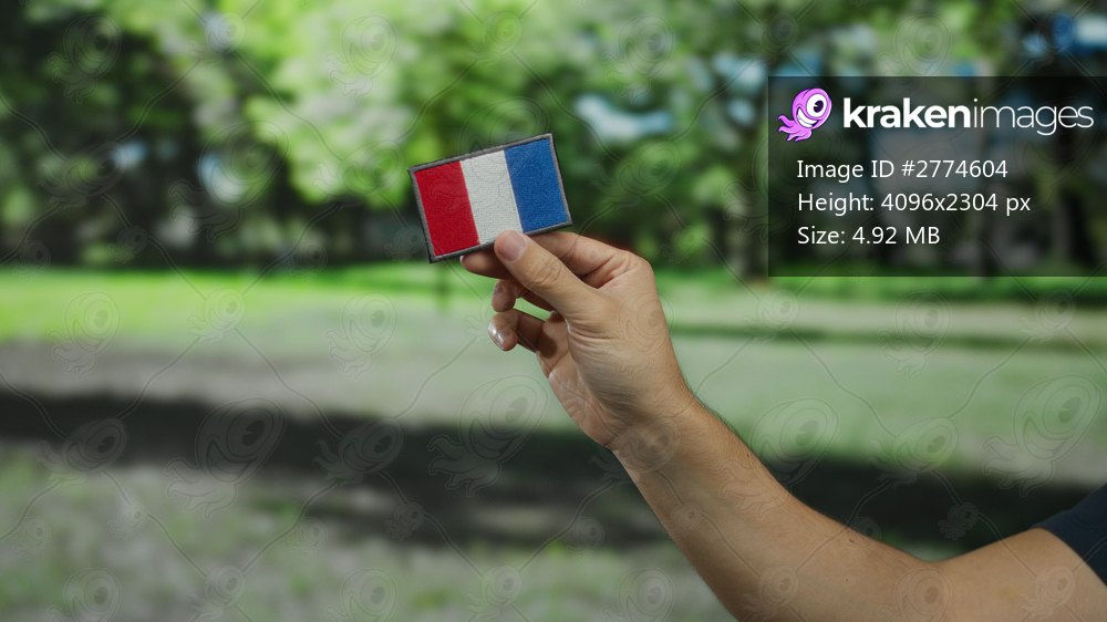 Male hand holding a french flag patch outdoors in a park during daytime showcasing patriotism and vibrant colors.