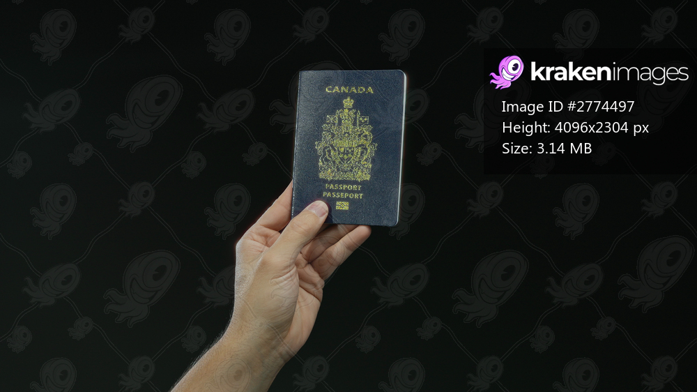 Male hand holding canadian passport against a black background highlighting travel identity concept with isolation.