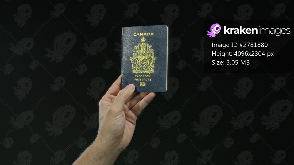 Male hand holding canadian passport against a black background highlighting travel identity concept with isolation.