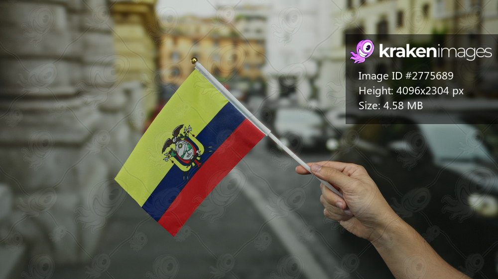 Male hand holding ecuadorian flag on busy city street offers vibrant depiction of national pride and urban diversity in ecuador.