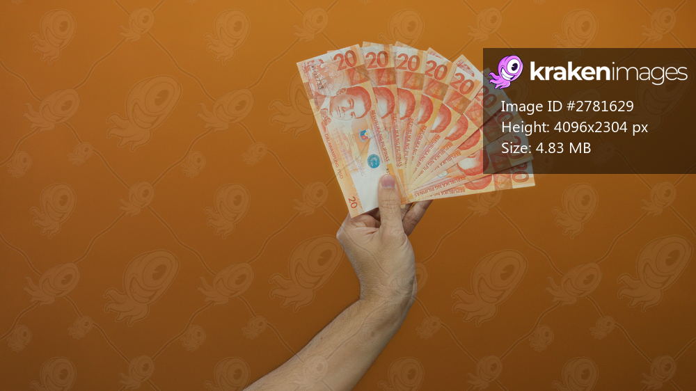 Male hand holding filipino peso banknotes against an orange wall background, highlighting currency and monetary concepts.