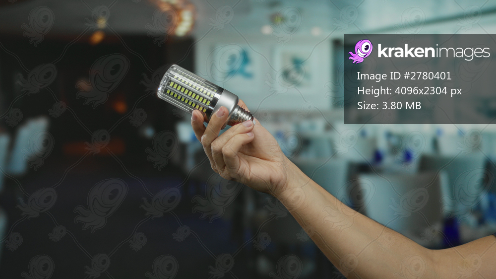 Male hand holding led bulb indoors at a restaurant setting, showcasing the intersection of energy-efficient technology and dining ambiance.