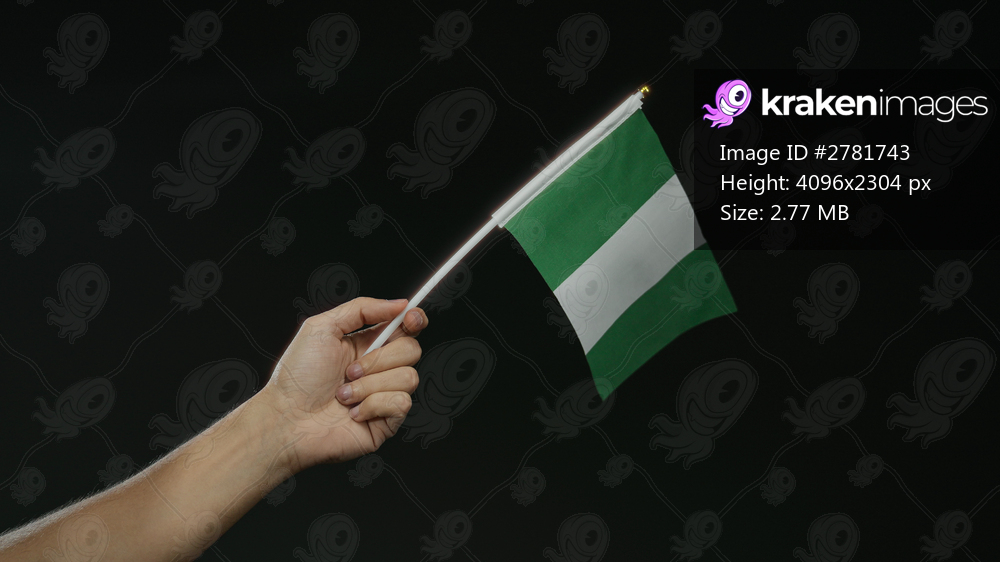 Male hand holding nigerian flag against dark background, showcasing national pride and cultural identity in an isolated setting.