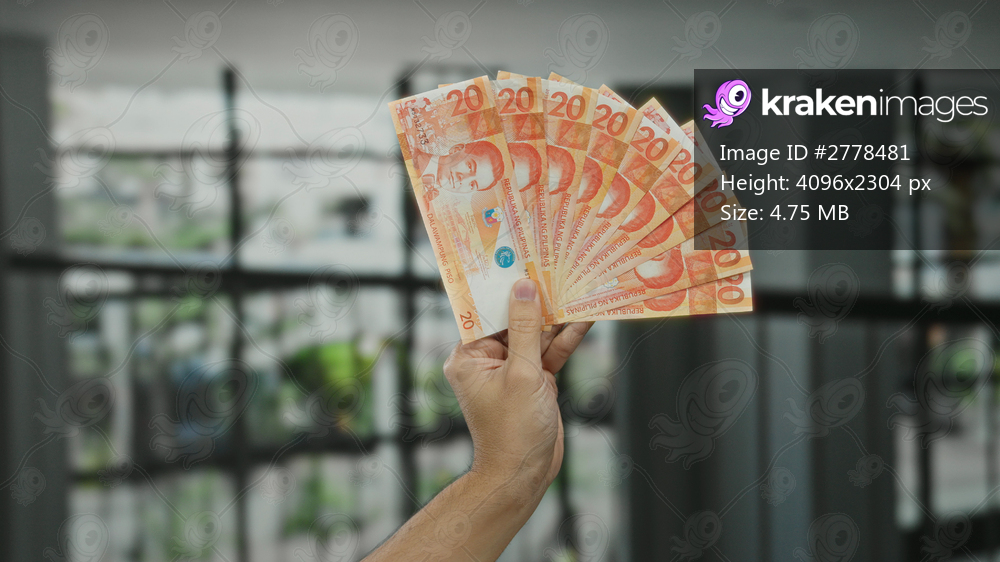 Male hand holding philippine pesos in hotel setting, highlighting currency indoors with a focus on wealth, finance, and international travel concepts.