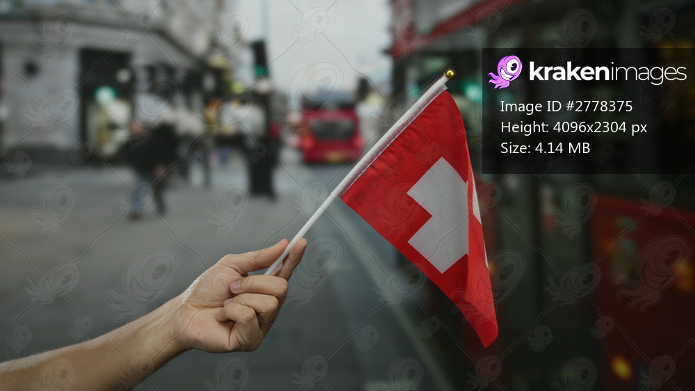 Male hand holding swiss flag in bustling city street with blurred red bus in background symbolizes switzerland in urban setting enhancing cultural vibe. - Kraken Images