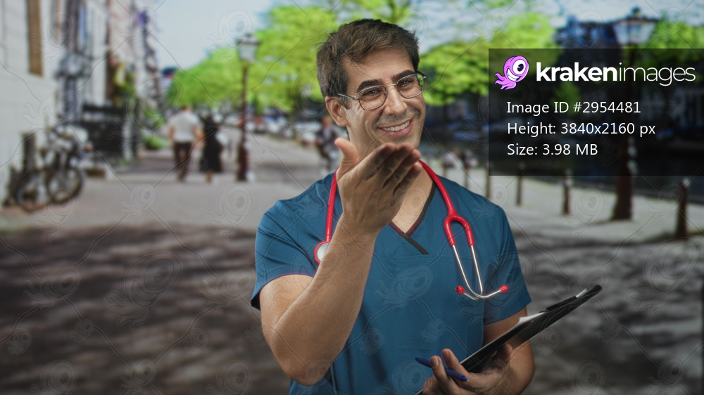Male hispanic doctor in blue scrubs with red stethoscope blows a kiss while holding a clipboard on a street canal promenade with bicycles and lampposts; warmth reassurance. - Kraken Images