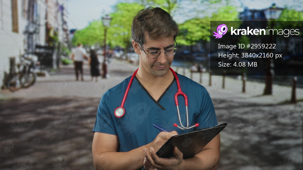 Male hispanic doctor in blue scrubs with red stethoscope blows a kiss while holding a clipboard on a street canal promenade with bicycles and lampposts; warmth reassurance. - Kraken Images