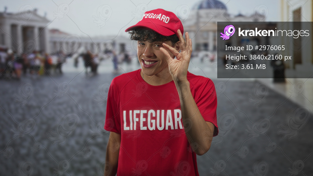 Male lifeguard teenager showing ok sign with hand in front of building, wearing red lifeguard cap and shirt, smiling and posing; playful confidence.