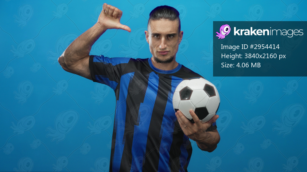 Male soccer player holds a soccer ball and makes a thumb down gesture in studio; disapproval attitude.