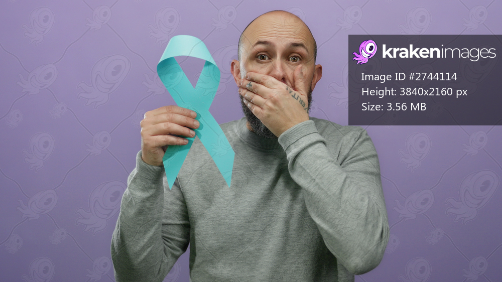 Man with a beard and bald head holds a teal awareness ribbon while covering his mouth in surprise against a purple background