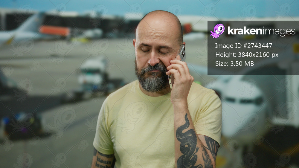 Man with a beard using cellphone at airport with airplanes visible and outdoor atmosphere, showcasing travel and communication in terminal setting