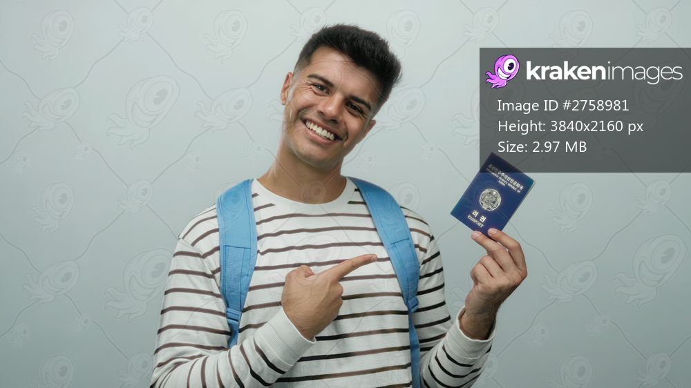 Man with a blue backpack smiling and pointing at a korean passport held in hand against a white background, showcasing identification and travel readiness. - Kraken Images