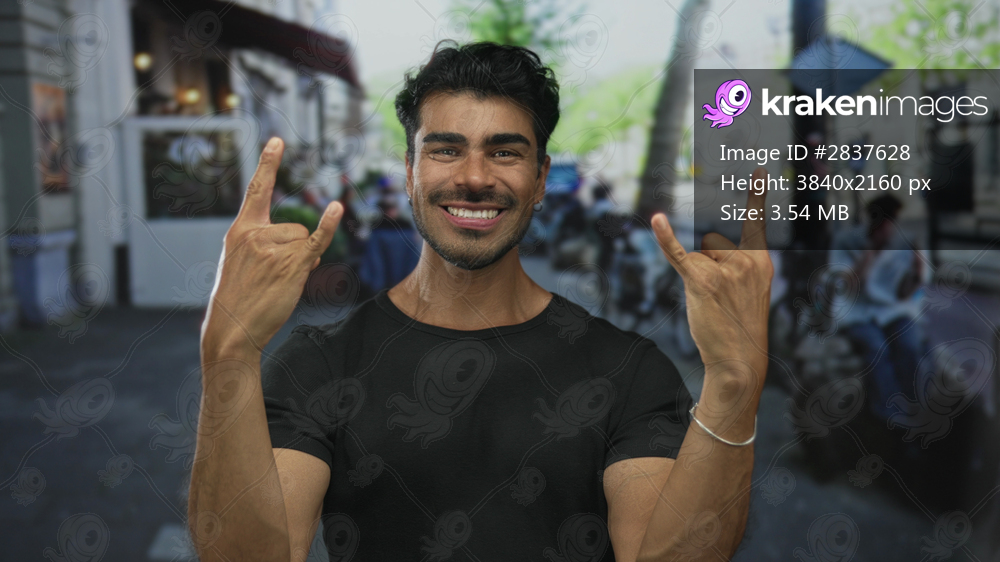 Man with a broad smile shows rock horns with both hands on a city street amid blurred bicycles and buildings; excitement fun metal.