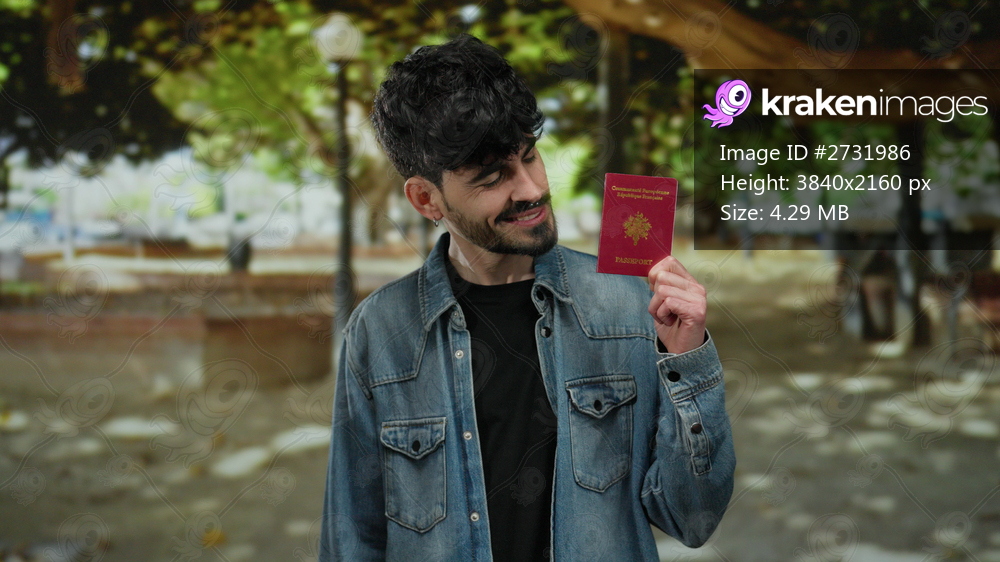 Man with a french passport smiles confidently outdoors amidst a serene urban setting, surrounded by lush green trees casting gentle shadows on the pathway. - Kraken Images