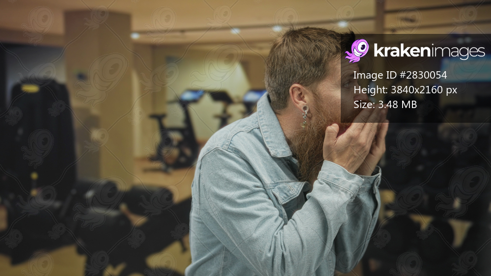 Man with a full red beard covering his mouth and face with raised hands in building; surprise.