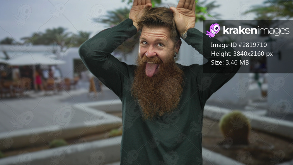 Man with a long ginger beard holds hands to head in playful horns gesture on a busy city street; playfulness.