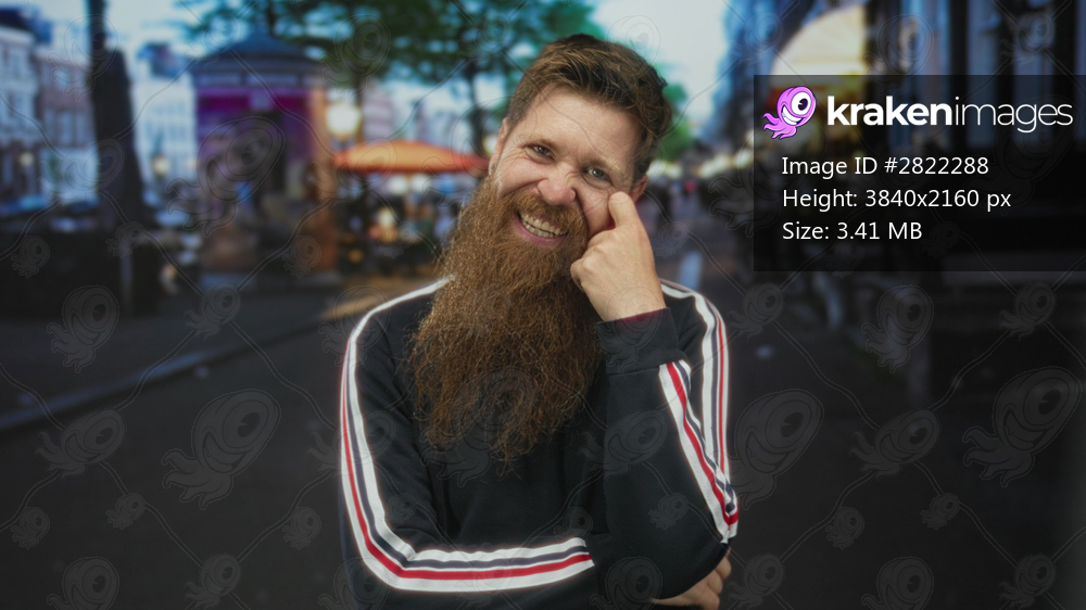 Man with a long red beard wearing a black sweatshirt with striped sleeves smiling under streetlights on a street; happiness optimism.