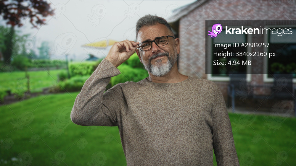 Man adjusting glasses with hand by a house entrance and building facade, raised eyebrow expression; skepticism reflection experience.