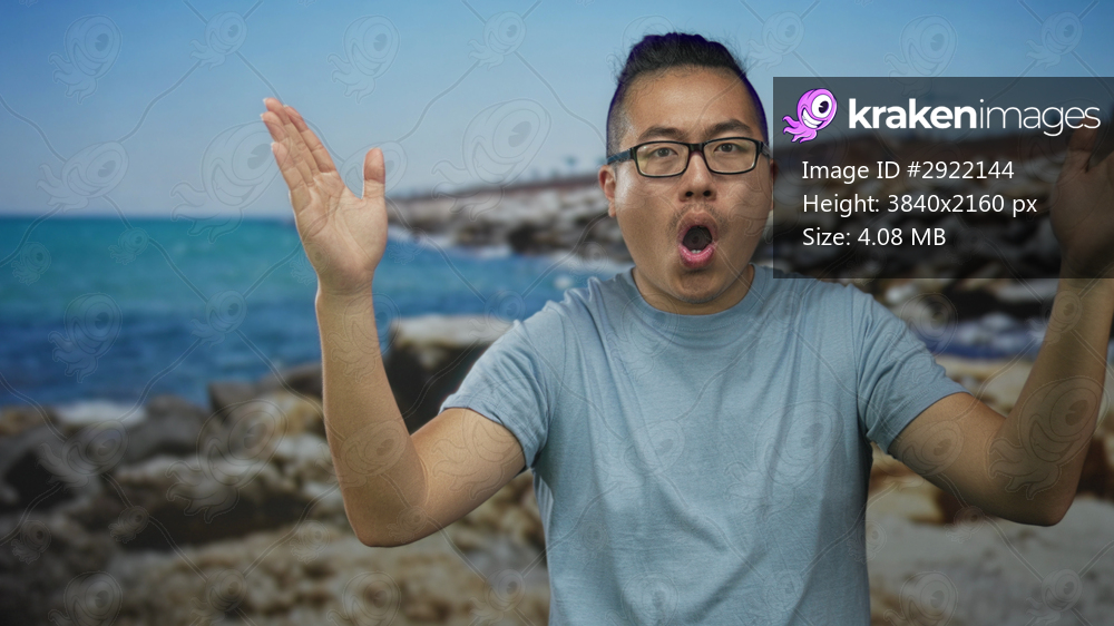 Man adjusting glasses while raising hands toward head in studio coastal set by rocky shore; surprise reaction.