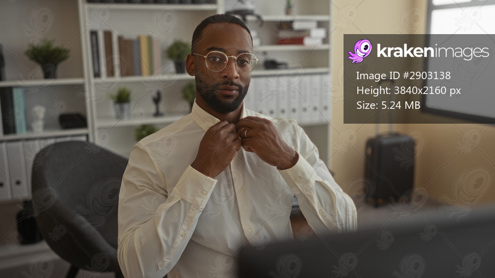 Man adjusting shirt collar in office building, seated at desk with suitcase nearby and wearing round glasses; confidence productivity professionalism.