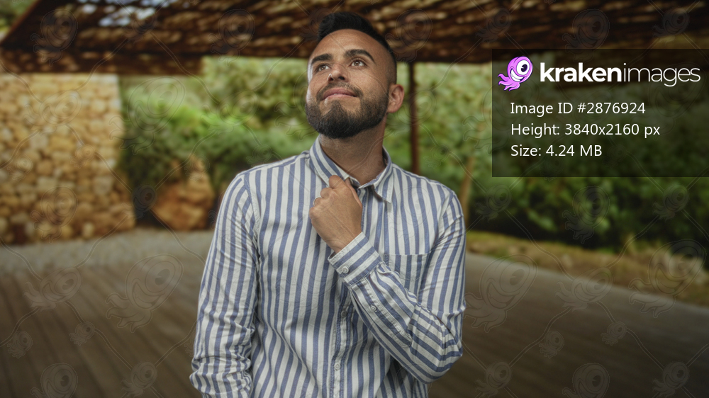 Man adjusting striped shirt collar with hand to neck under wooden pergola at building, looking upward; introspection.