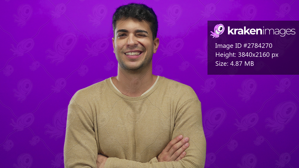 Man adjusts arms then crosses them in a studio scene featuring young hispanic guy who smiles happy against a purple backdrop.