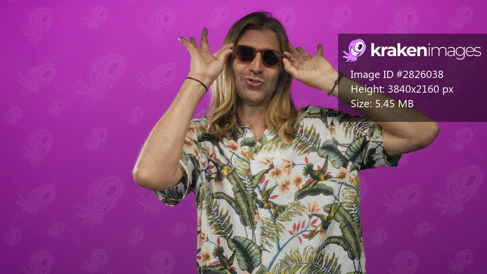 Man adjusts brown sunglasses with one hand and shows open mouth expression in vibrant purple studio; surprise joy.