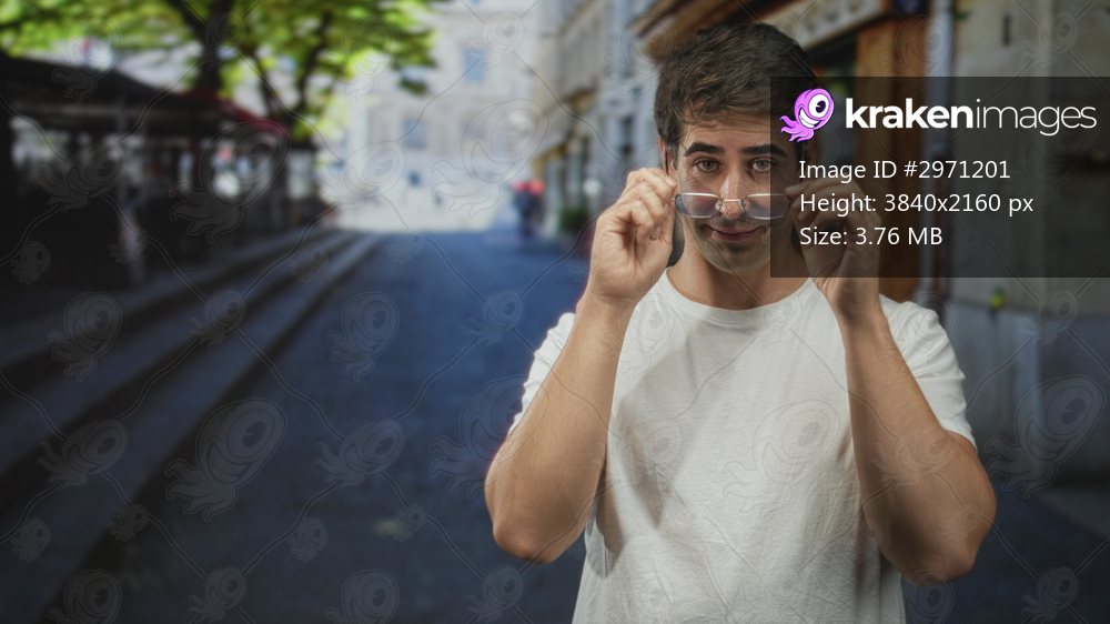 Man adjusts eyeglasses with hands and fingers while smiling in a narrow street near steps and shops; thoughtful introspection.
