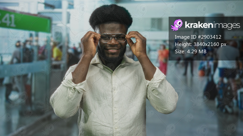 Man adjusts glasses and crosses arms in busy airport terminal while smiling at camera; confidence travel ease.