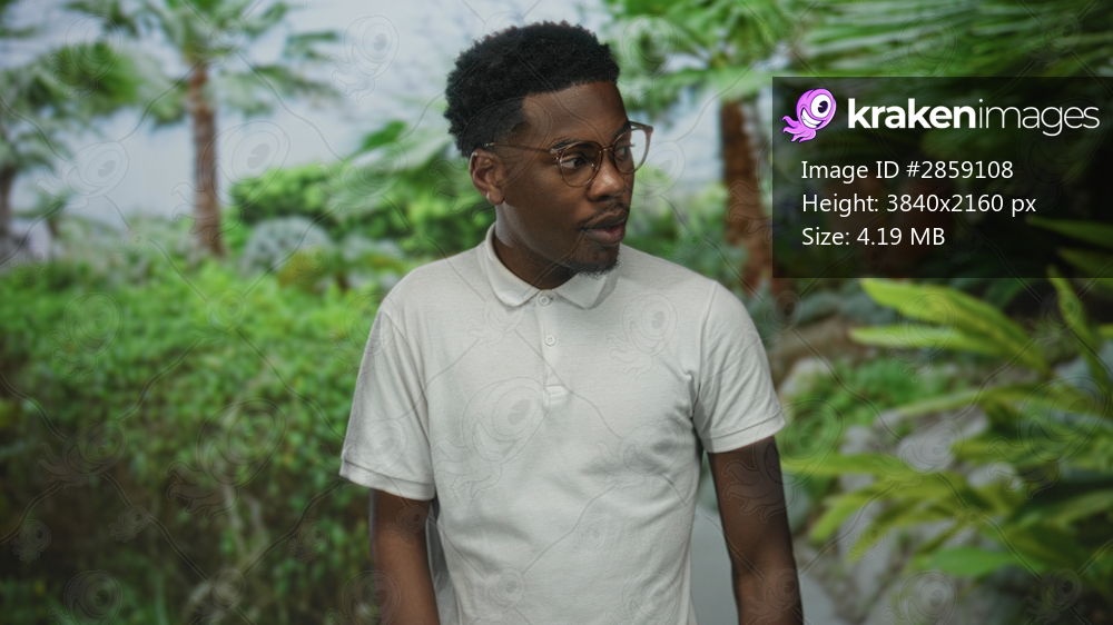 Man adjusts glasses on his face along a leafy forest path in warm morning sunlight; quiet reflection.