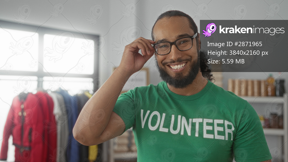 Man adjusts glasses while smiling in donation building with clothing rack and food shelves visible; generosity community service.