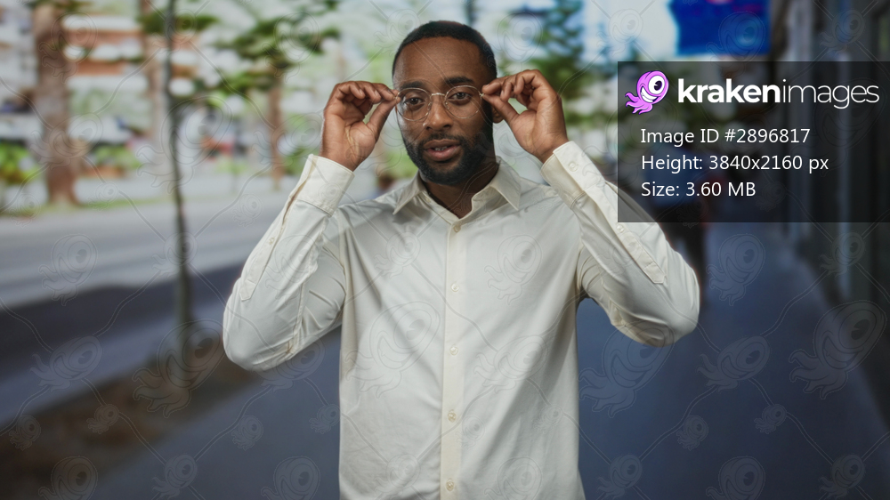 Man adjusts round eyeglasses with both hands near face while walking down a city street in a white shirt with a neutral expression; calm determination. - Kraken Images