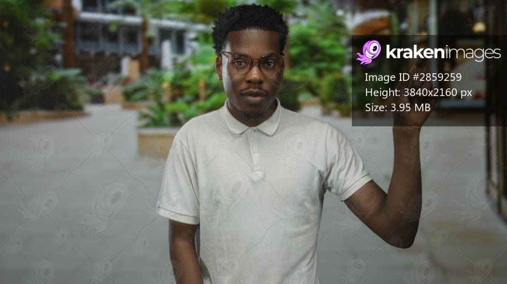 Man african american brings finger to lips for silence on a street flanked by urban buildings; quiet contemplation.