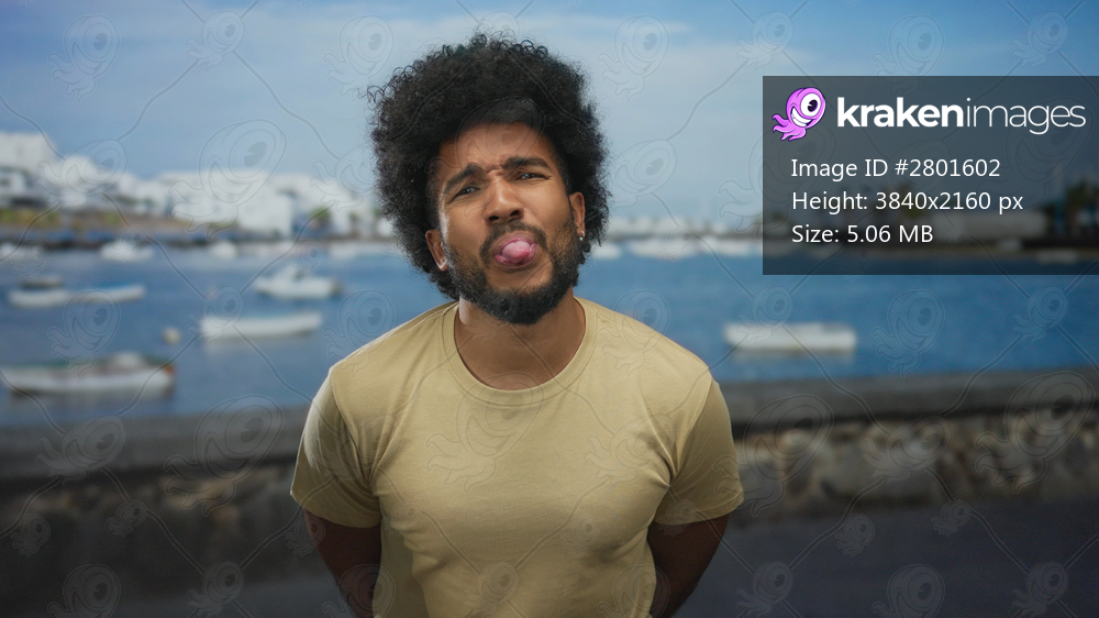 Man with afro at seaside port playfully sticking out tongue with boats in background on a sunny day.