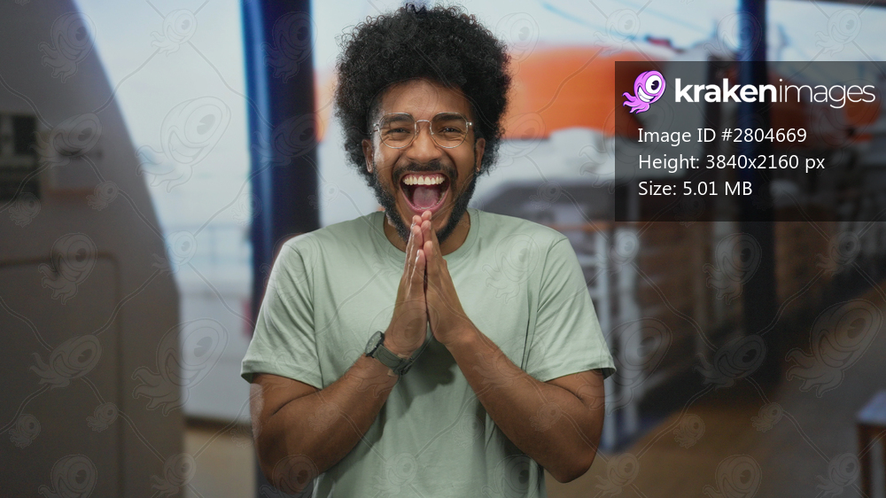 Man with afro hair smiling on a cruise ship, enjoying a maritime adventure outdoors, embodying joy and freedom at sea with railings and lifeboats visible. - Kraken Images