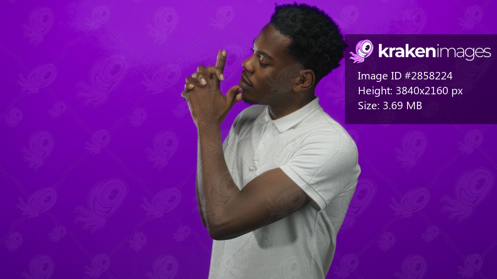 Man aims finger gun gesture at camera in bright purple studio with intense gaze and outstretched arms; confidence.