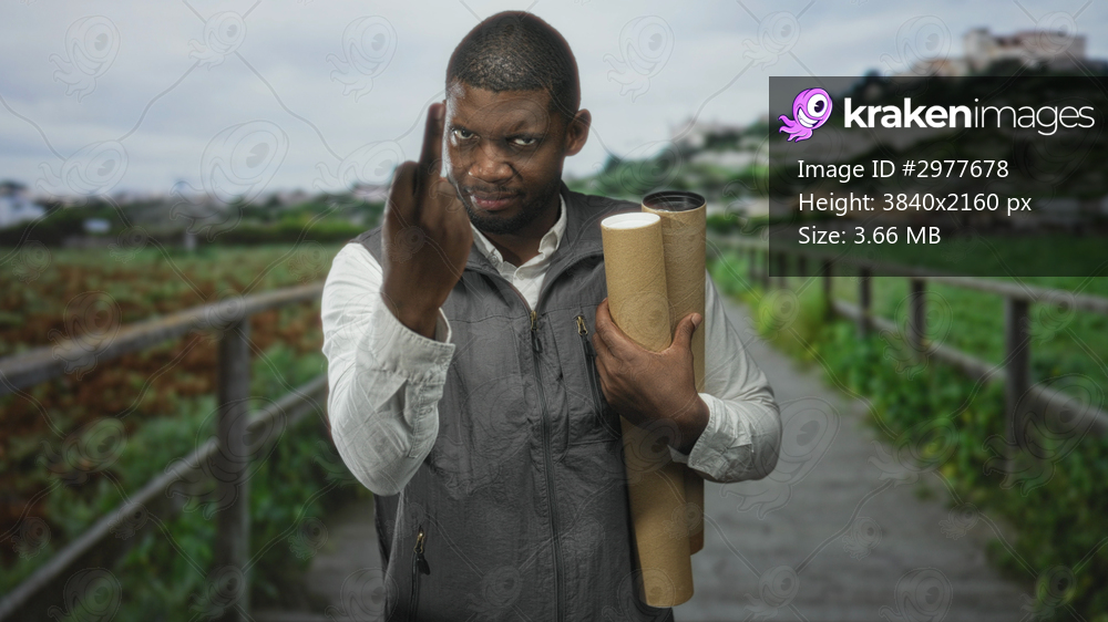 Man architect holding rolled blueprints and coffee cup shows middle finger toward camera on street near houses and railing; defiance.