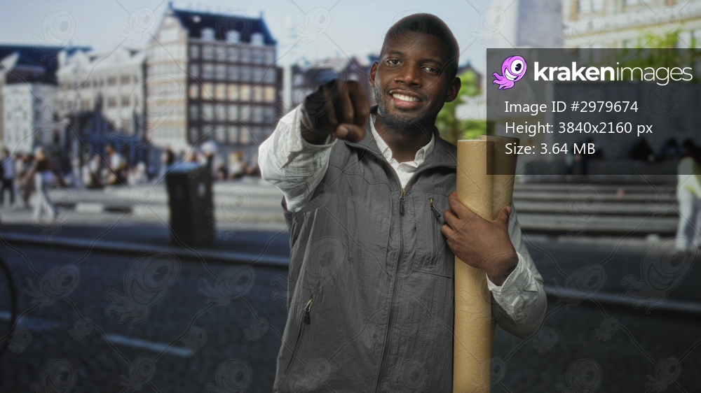 Man architect holding rolled blueprints with hand and pointing finger toward camera in busy european street, wearing grey vest and white shirt; confidence ambition. - Kraken Images