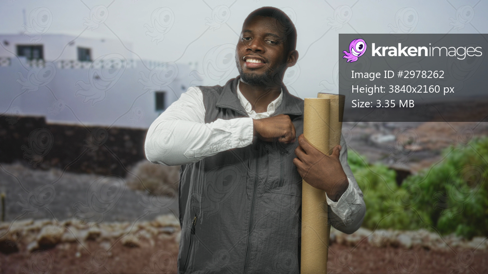 Man architect holding rolled blueprints points finger to camera at building site while smiling and clutching plans; confidence planning vision.