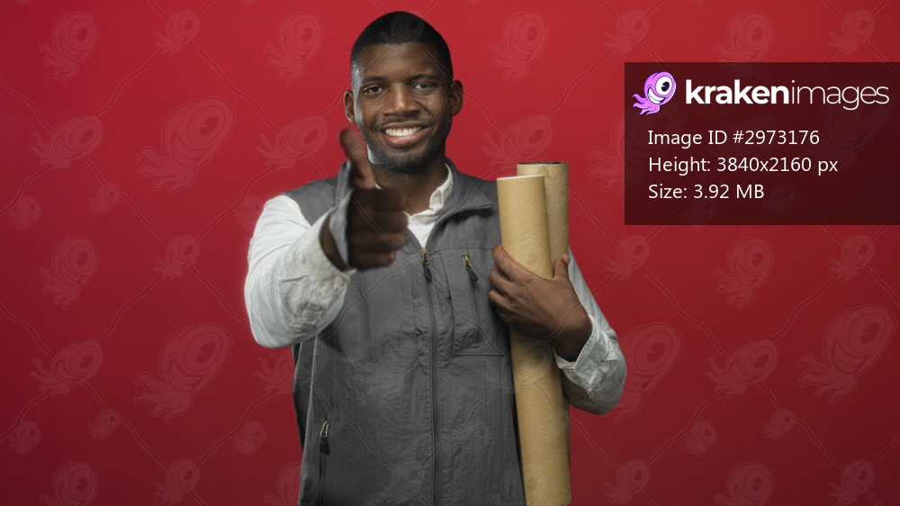 Man architect holding rolled blueprints and smiling gives thumbs up while wearing a vest in a red studio setting; professional confidence.