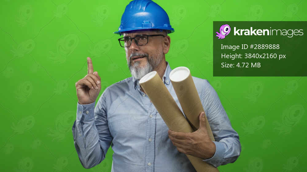 Man architect in blue hardhat holding rolled plans and pointing finger in studio; design planning confidence.
