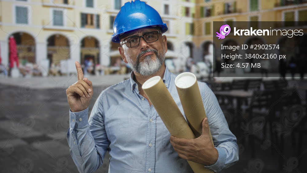 Man architect wearing blue hard hat holding rolled plans and pointing finger at a building; planning confidence.
