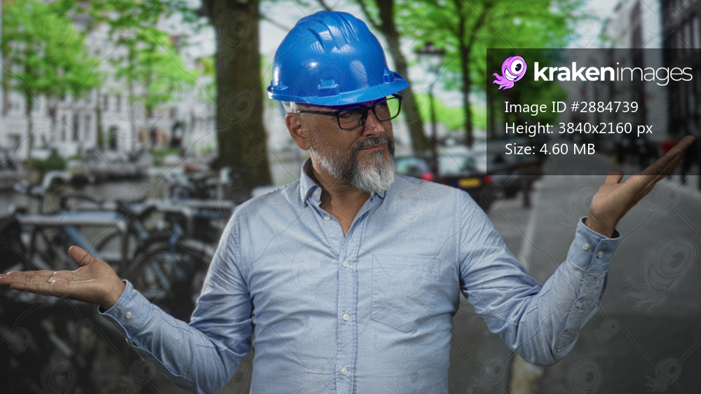 Man architect wearing blue hardhat and glasses holds palms up shrugging on a city street lined with bicycles and parked cars; design uncertainty.