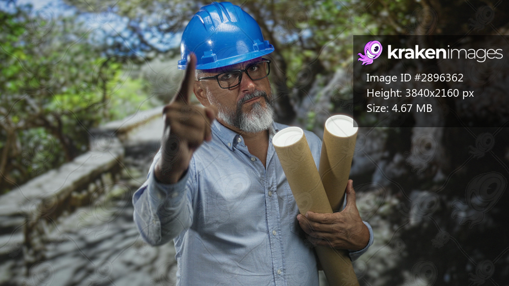 Man architect wearing blue hardhat and glasses holds rolled plans and stands with hand on hip in forest pathway; steady confidence.