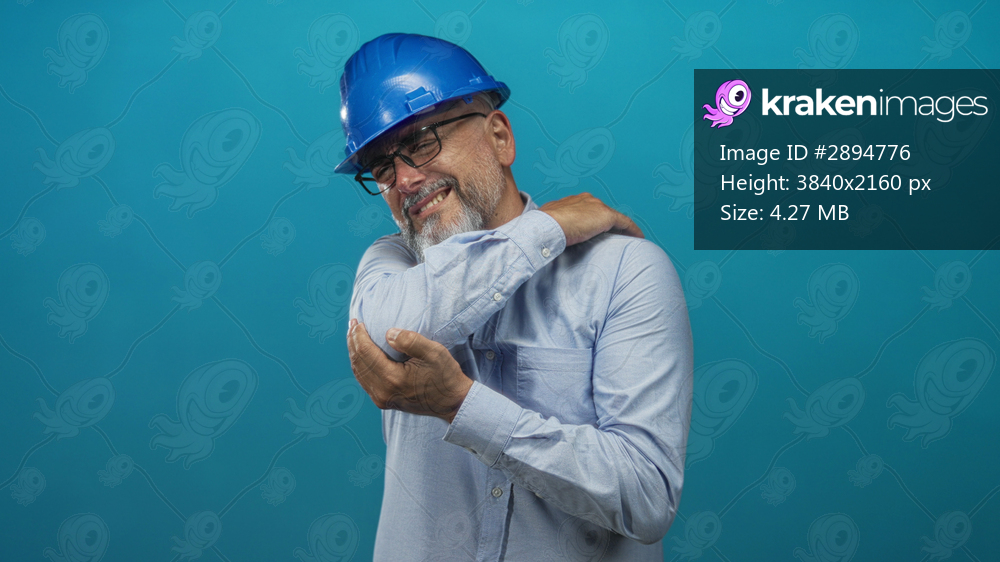 Man architect wearing blue hardhat and glasses smiling while holding elbow in teal studio; confidence safety planning.