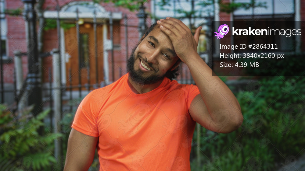 Man with arms crossed at building entrance wearing bright orange shirt smiling broadly; friendly confidence.